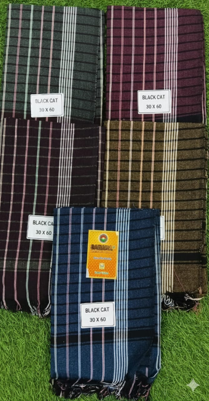 .These Black Cat Handloom Cotton Gamchas come in a premium 30×60 size, offering perfect usability for daily needs. Made from durable cotton yarn, the fabric is soft, absorbent, and quick-drying. The classic checkered pattern in multiple colours gives a traditional handloom touch.