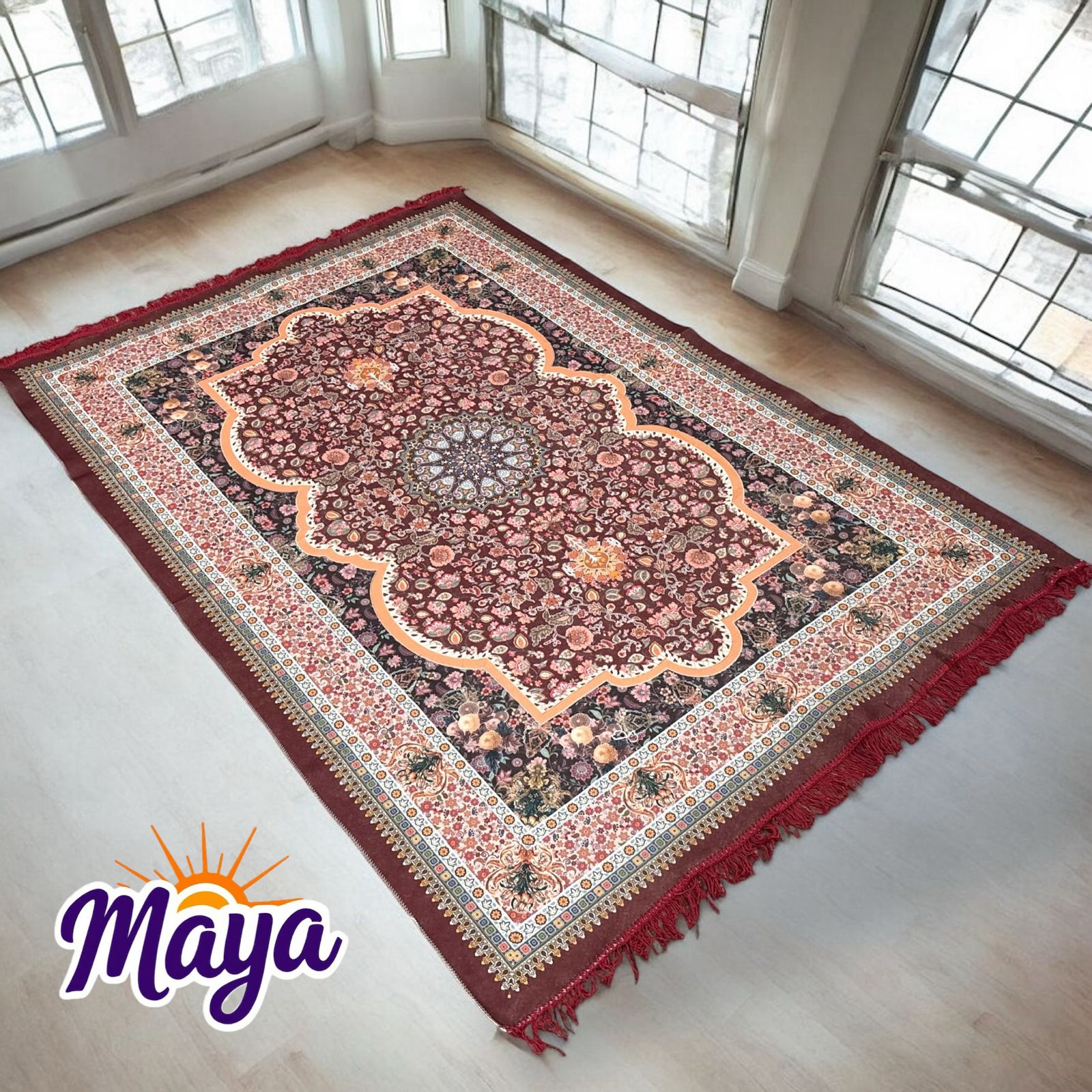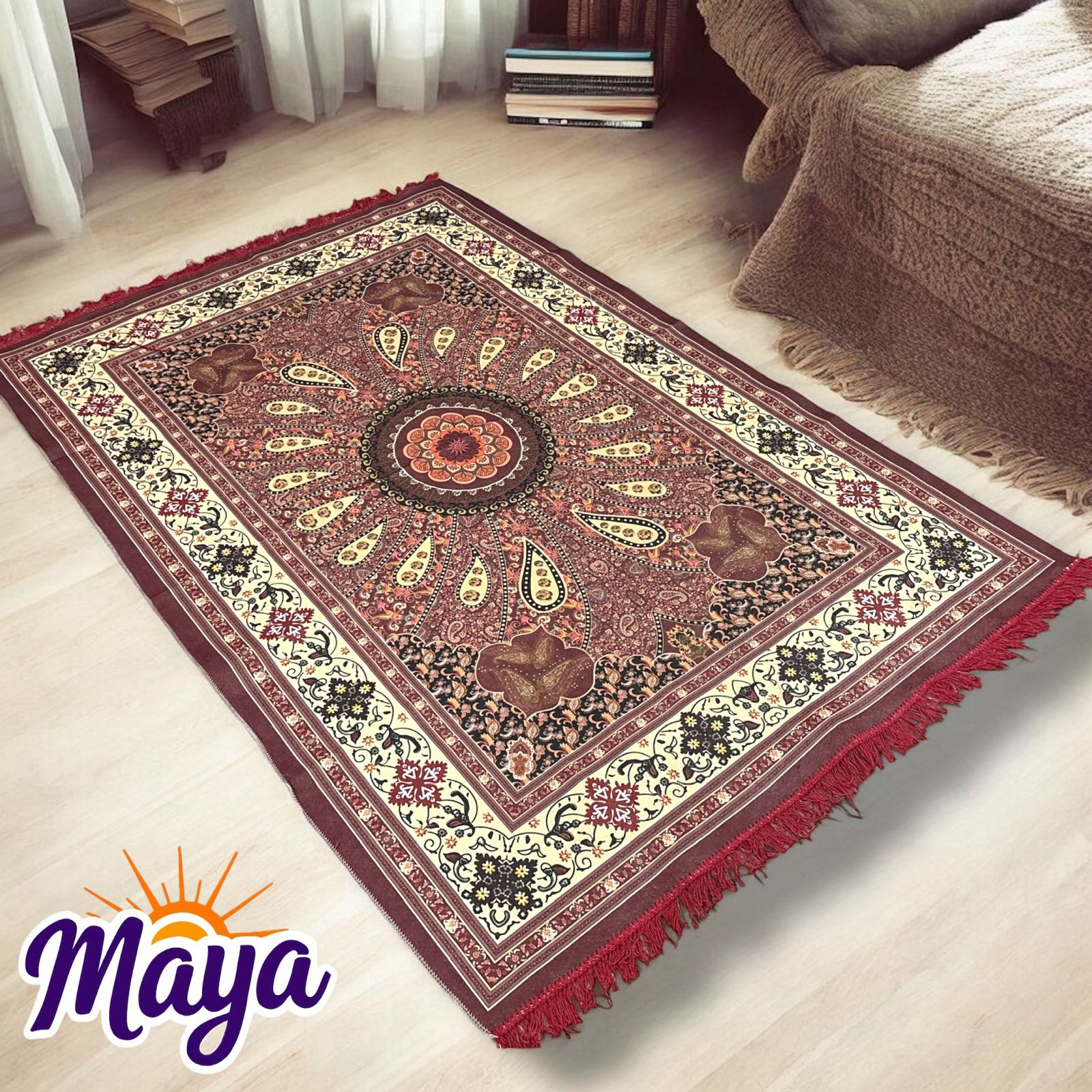 Carpet Water Absorption Kalamkari Paisley Pattern Floor Mat|Velvet Sitting Carpet for Hall, Living Room, 5x7 Feet (Maroon)