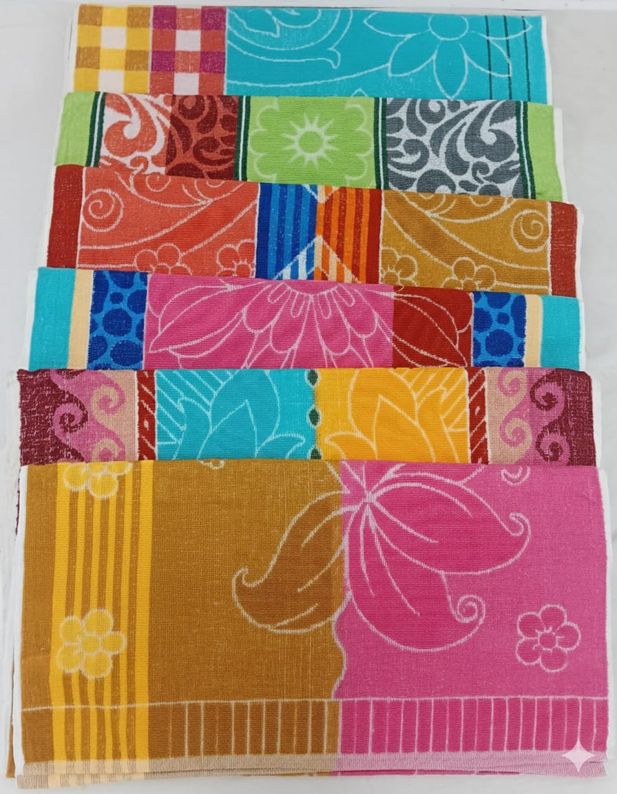 This set of 6 multicolor cotton hand towels carries mixed floral and geometric prints that look vibrant and fresh. Each towel is made from soft, quick-absorbing cotton fabric suitable for kitchen use, hand drying, face use, or general household cleaning. The towels are lightweight, easy to wash, और जल्दी सूखने वाले—daily use के लिए practical choice. Multi-color designs होने से पूरा pack attractive और value-for-money बनता है।