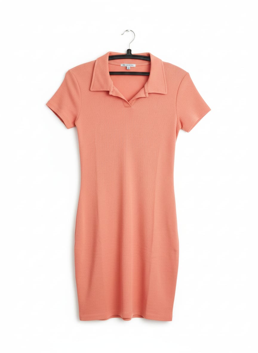 This Peach Ribbed Polo Bodycon Mini Dress blends comfort with a sharp, modern look. Made from soft stretchable rib-knit fabric, it hugs the body beautifully while keeping you comfortable all day. The classic polo collar with a V-notch adds a clean and classy touch, making it perfect for both casual and semi-dressy outings. Pair it with sneakers for a daytime look or heels for an evening style — effortless and stylish either way.