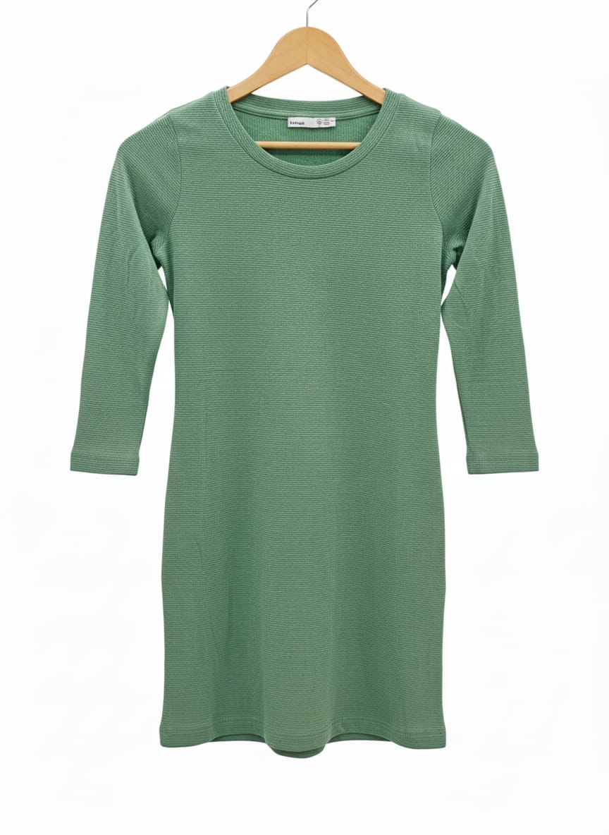 This ribbed full-sleeve bodycon mini dress is designed with soft, stretchable knit fabric that naturally contours your shape without feeling tight. The dress offers a clean, modern silhouette with a comfortable round neckline and a flattering above-knee length.