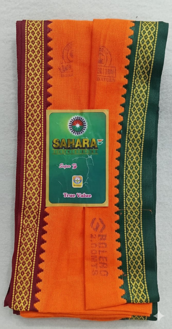 This Sahara Golden Collection Pure Cotton Dhoti features a vibrant orange base with beautifully woven maroon and green borders. The fabric is 100% cotton, giving comfortable breathability for all-day wear. It’s lightweight, durable, and holds its shape well even after multiple washes. Ideal for pooja, functions, traditional ceremonies, and everyday comfort. A reliable choice for customers who prefer quality over fancy marketing.