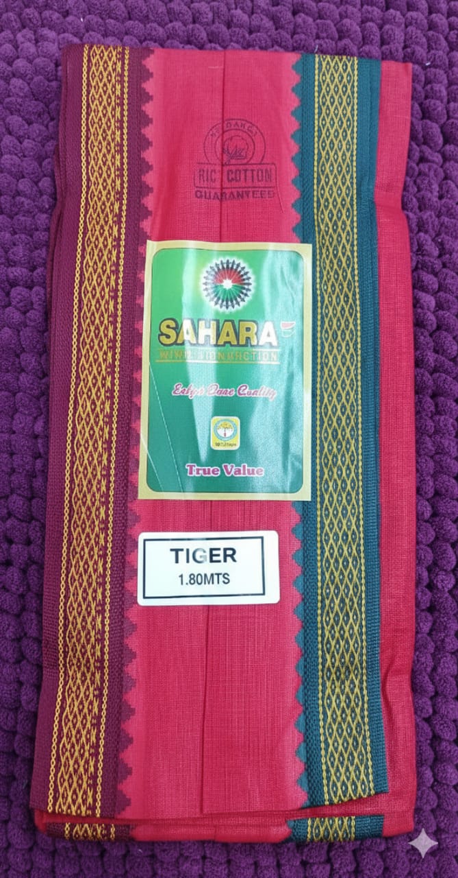 This Sahara Rich Cotton Lungi comes in a deep red tone with premium heavy borders on both sides—one in maroon–yellow traditional pattern and the other in green–yellow woven design. Made from soft cotton, it stays cool, absorbs sweat well, and gives full-day comfort. The fabric doesn’t lose shape after washing and the borders add a strong traditional look. Ideal for daily wear, summer use, or casual traditional styling. Length approx. 1.80 meters (Tiger edition).