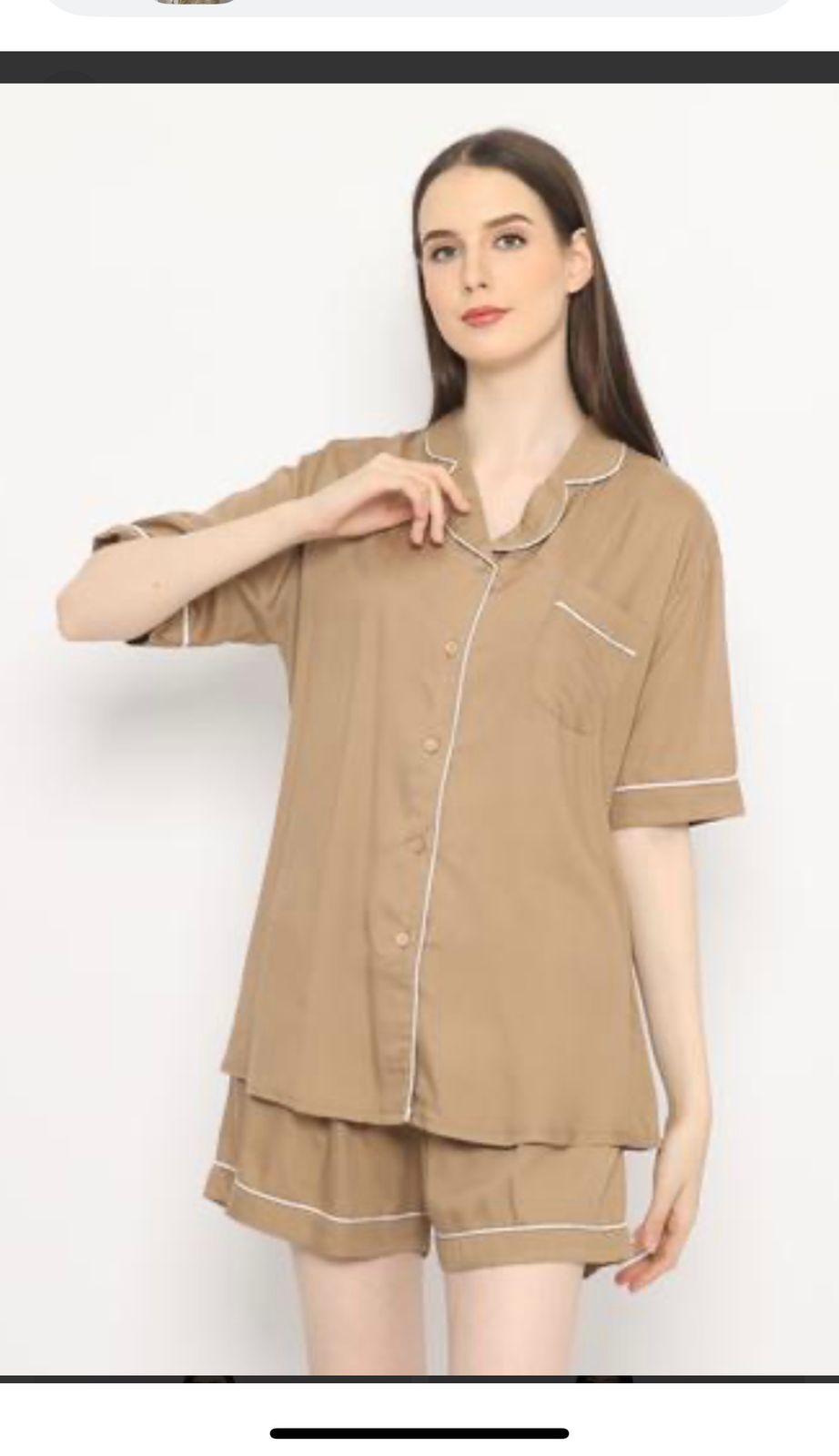 This beige night suit set is made from soft, lightweight fabric designed for comfortable all-night wear. The top comes with a relaxed fit, button-down front, and contrast piping for a neat look. The matching shorts have an easy elastic waistband for a comfy fit.