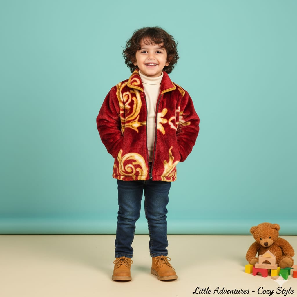 This premium unisex kids jacket is made from super-soft bhalu fleece fabric that gives strong warmth like a blanket. The material is plush, cozy, and gentle on children’s skin. The front zipper makes it easy to wear, and the full-sleeve design ensures full protection from cold winds.