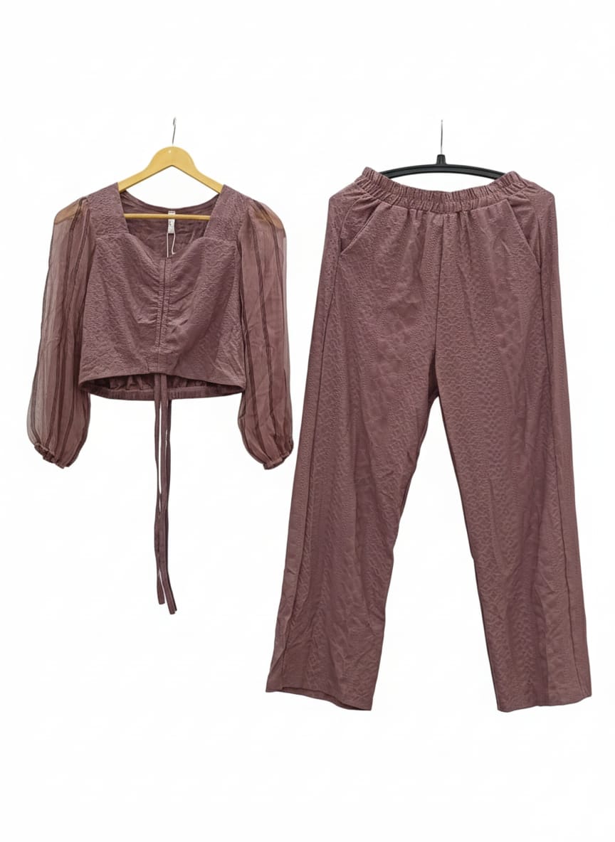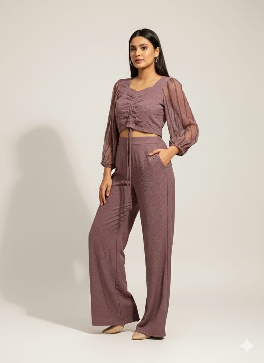 This stylish mauve co-ord set features a textured stretch fabric with a soft, comfortable feel. The top comes with sheer balloon sleeves and a front drawstring detail for a flattering fit. The matching high-waist pants are lightweight, flowy, and include side pockets. Perfect for outings, casual events, parties, and everyday comfort.