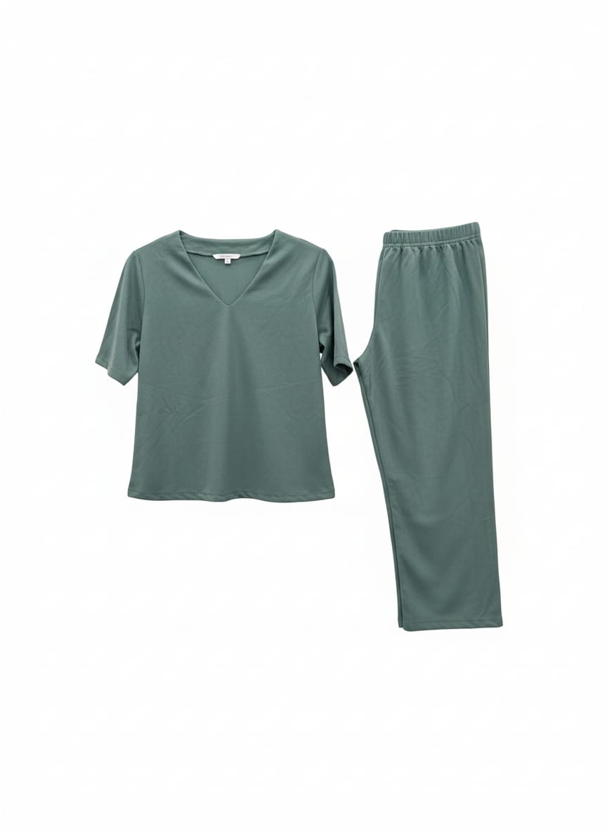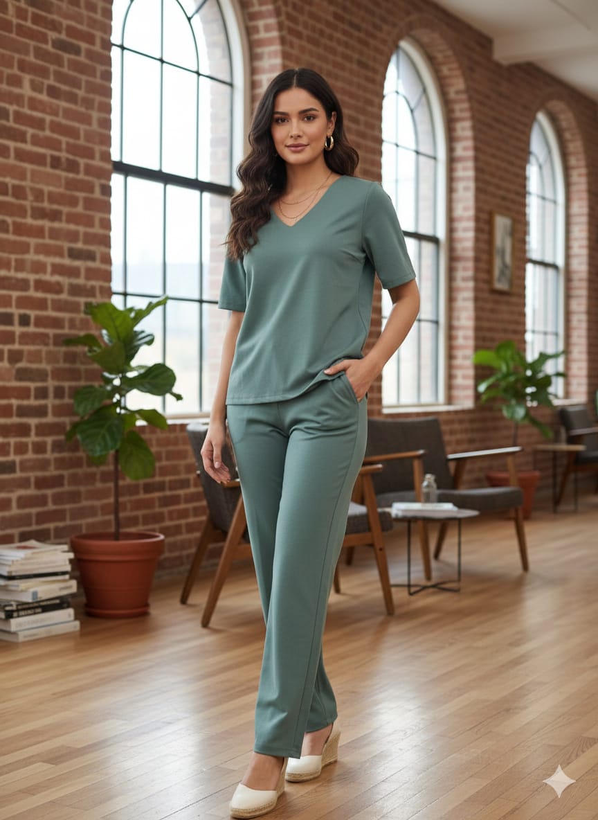 This Premium Women’s Co-ord Set is designed for effortless style and all-day comfort. The top comes with a V-neck and half sleeves, giving a clean andMade with soft, breathable, stretchable fabric, this co-ord is ideal for long hours — whether you’re at work, traveling, or just stepping out casually. The smooth finish and elegant pastel tint keep the outfit looking fresh and classy without trying too hard. minimal look. The matching straight pants offer a relaxed yet polished fit, making the entire set perfect for everyday wear.